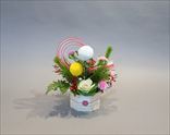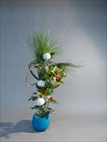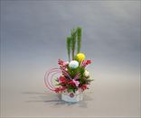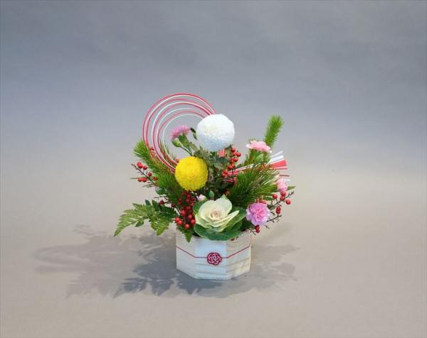 お正月の花 若松、テンミ、ピンポン菊、スプレーカーネーション、葉ボタン、レザーファン