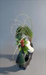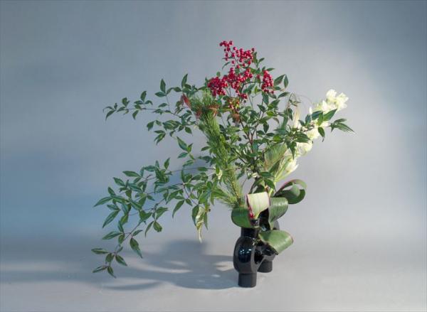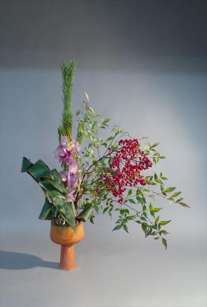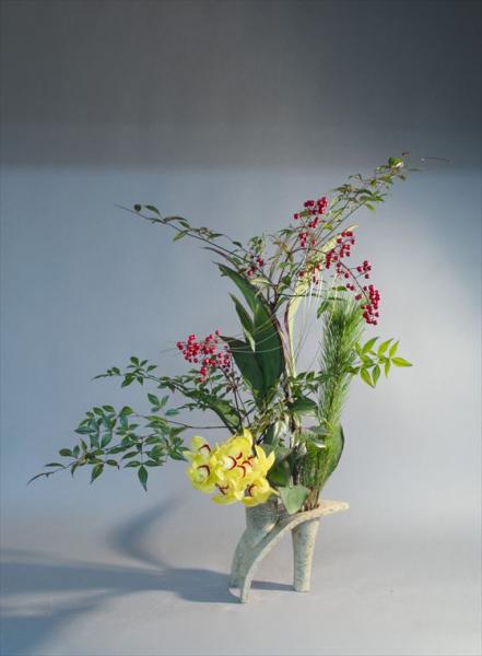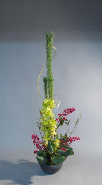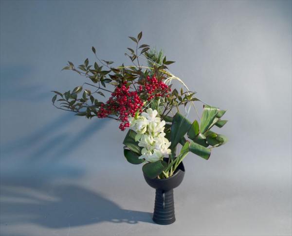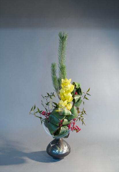 新春を活ける シンビジューム、実付き南天、若松、ドラセナ